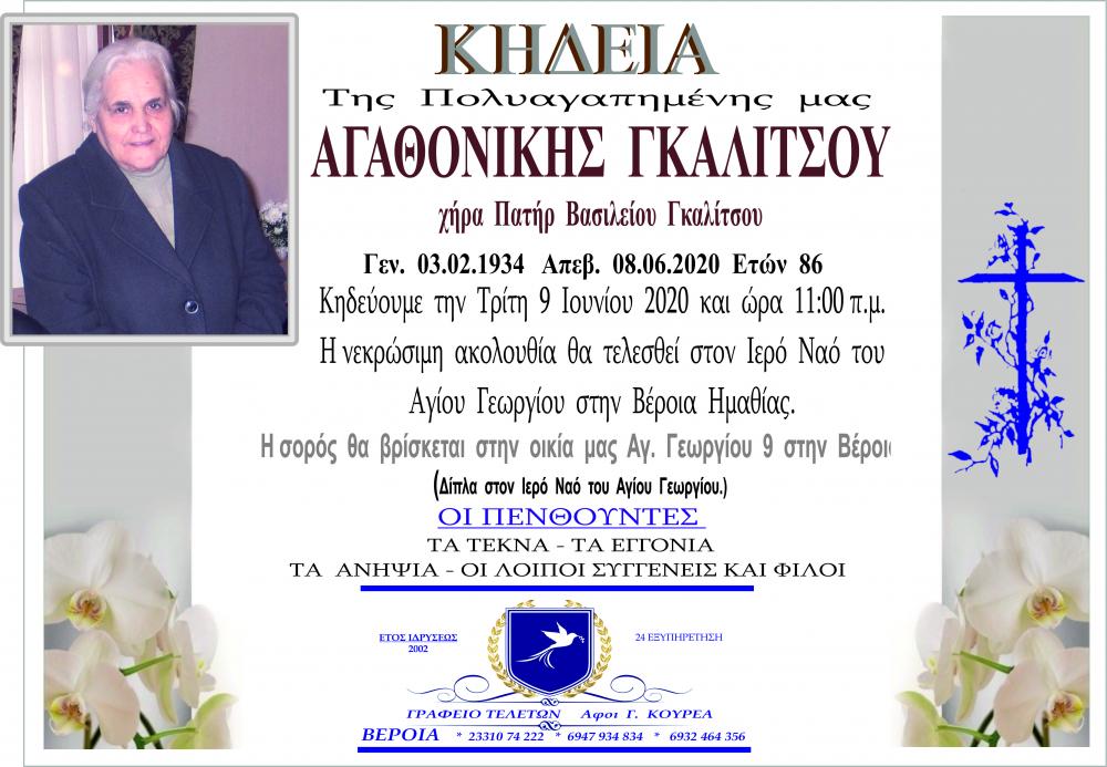Το Γραφείο Τελετών Κουρέα ανέλαβε την Κηδεία της πολυαγαπημένης Αγαθονίκης Γκαλίτσιου, η οποία και θα τελεστεί στον Ιερό Ναό του Αγίου Γεωργίου στην Βέροια.