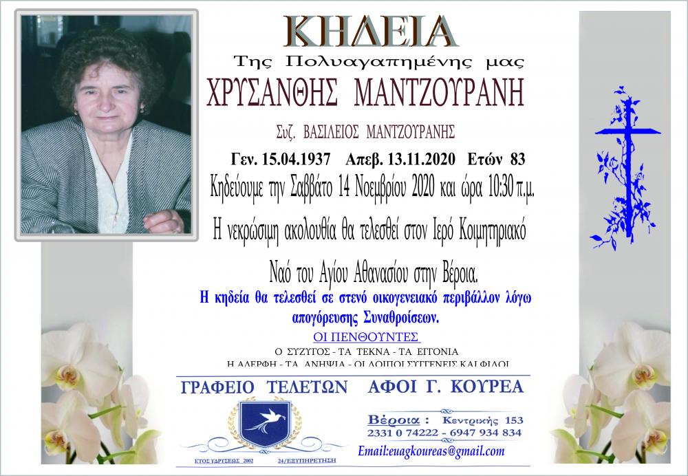 Το Γραφείο Τελετών Κουρέα ανέλαβε την Κηδεία της πολυαγαπημένης Χρυσάνθης Μαντζουράνη, η οποία θα τελεστεί στον Ιερό Κοιμητηριακό Ναό του Αγίου Αθανασίου στην Βέροια.