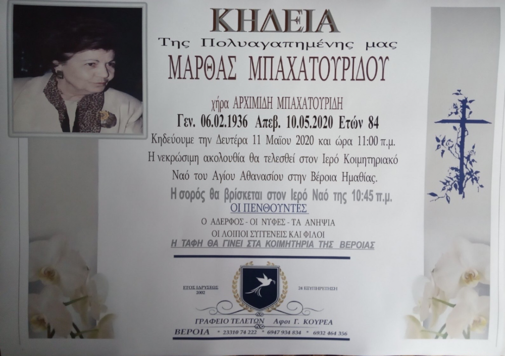 Το γραφείο τελετών Κουρέα αναλαμβάνει κηδείες, μνημόσυνα, μεταφορά σορών, αποτέφρωση και επαναπατρισμούς με δύο παραρτήματα – γραφεία τελετών σε Βέροια και Αιγίνιο.