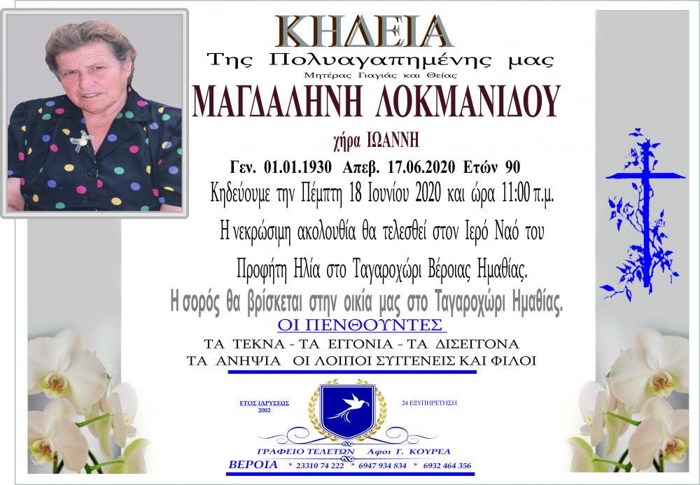 Το Γραφείο Τελετών Κουρέα ανέλαβε να τελέσει την Κηδεία της πολυαγαπημένης Μαγδαληνής Λοκμανίδου, η οποία θα τελεστεί στον Ιερό Ναό του Προφήτη Ηλία στο Ταγαροχώρι Ημαθίας.